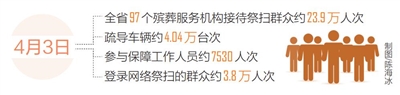 本报海口4月3日讯 (记者刘操 通讯员时权)4月3日是2021年清明节假期第一天,我省各市县迎来群众集中祭扫高峰。据省民政厅统计,全省97个殡葬服务机构接待祭扫群众约23.9万人次,疏导车辆约4.04万台次,参与保障工作人员约7530人次,登录网络祭扫的群众约3.8万人次,祭扫活动平稳有序开展。