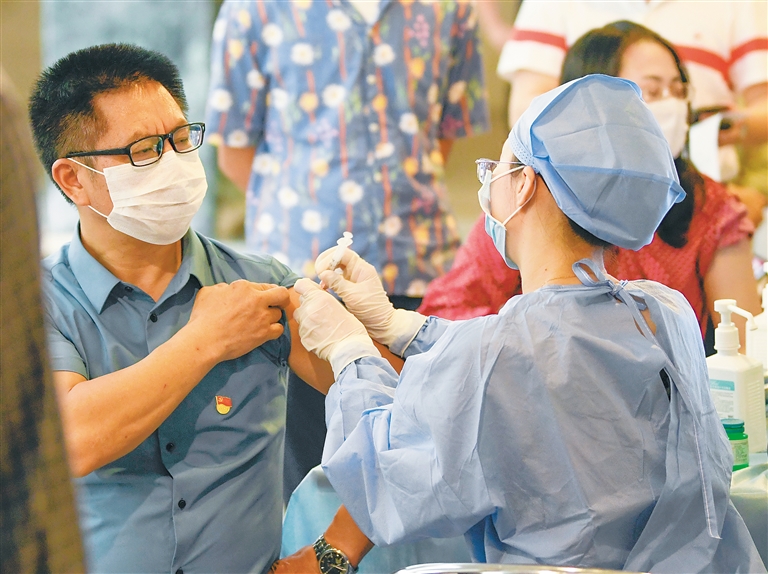 4月6日上午,我省省直机关人员在省委办公区临时接种点开始集中接种新冠疫苗,此次集中接种工作由海口美兰区新冠肺炎疫情防控指挥部组织开展。