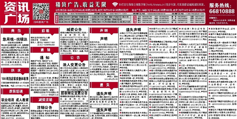 ●林海于2021年4月5日不慎遗失身份证(有效期限:2014年6月28日-2034年6月28日),证号:460032198102080017,声明作废。