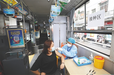 4月7日上午,海口首批20辆新冠疫苗移动接种车投入使用,这也是我省启用的首批新冠疫苗移动接种车。4月8日起,海口各工厂、企业、农村偏远地区如需上门接种,可向海口市卫健委或区级疾控中心申请使用。图为当天新冠疫苗移动接种车驶入海口市秀英区书场村文化广场,护士为市民接种新冠疫苗。