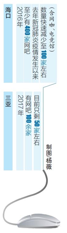 消费群体减少,昔日风光无限的网吧逐渐变得冷清,一些网吧被迫关门。何振平介绍,经协会初步统计,2016年海口至少有400家网吧,去年新冠肺炎疫情发生以来,海口网吧(包括网咖、电竞馆)数量快速减少至100家左右。不仅海口网吧数量在减少,岛内其他市县网吧数量也在减少。以三亚市为例,2017年该市有网吧百余家,如今只剩50家左右。