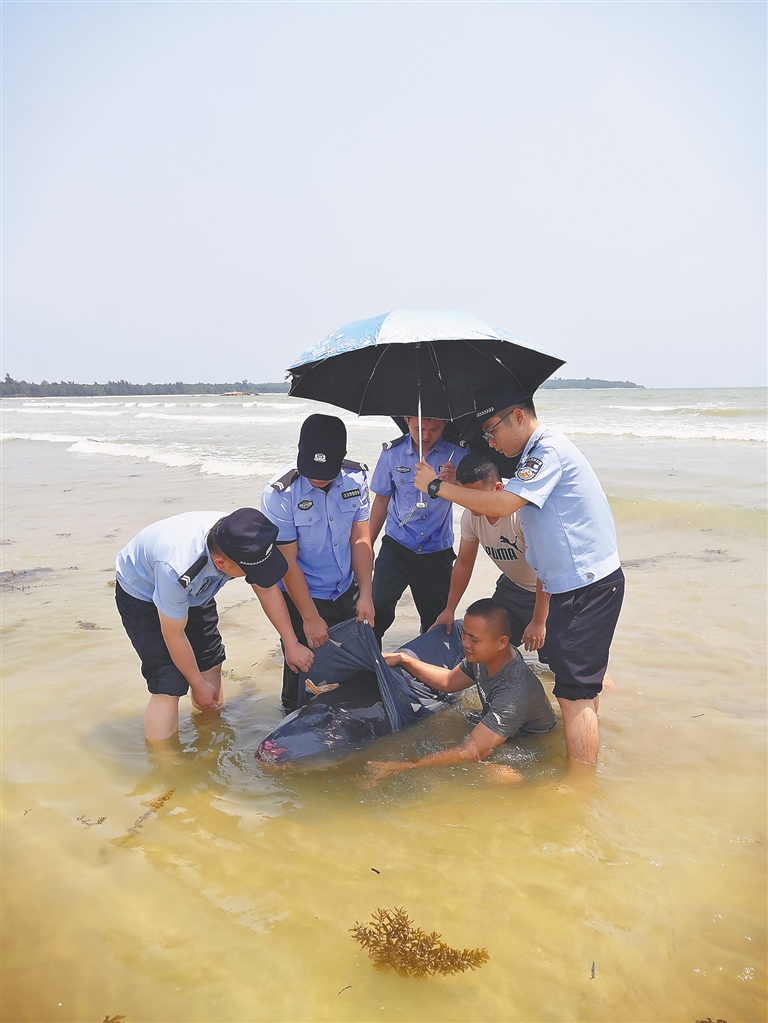 本报嘉积4月7日电 (记者良子 通讯员付昭辉 彭崴)4月7日,琼海龙湾港海岸派出所联合蓝海保育救护中心成功救助一条搁浅的鲸鱼。