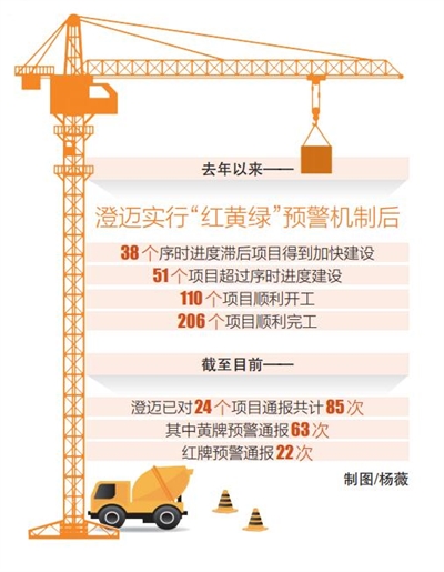 38个序时进度滞后项目得到加快建设、51个项目超过序时进度建设、110个项目顺利开工、206个项目顺利完工。去年以来,澄迈县实行“红黄绿”预警机制后,有效推动解决部分公共工程项目进展缓慢问题。这是海南日报记者4月8日从澄迈县有关部门获悉的。
