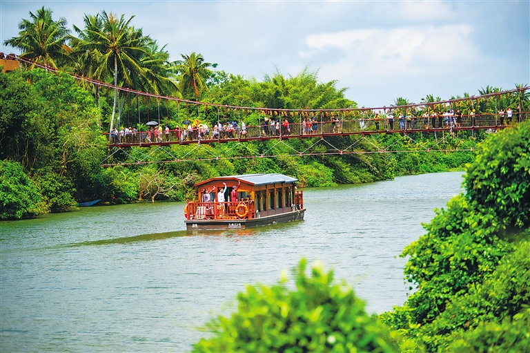 巧用生态做文章,是博鳌九曲生态公园的一大亮点。“这里地方风味比较浓,尤其是九曲江水穿过,和村里的一树一景搭配相得益彰。”游客修香成说。公园里,绿荫掩映的临水生态栈道、小巧别致的人工桥梁、独特优雅的南洋风情会客厅系列建筑、妙趣横生的农业果园,再加之微风掠过江面时的碧波荡漾,勾勒出一幅人与自然和谐相处的美好画卷。