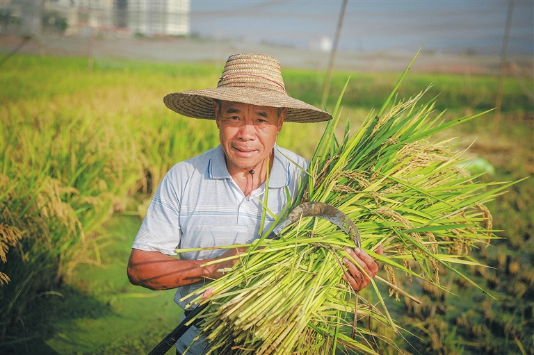 近日,在海南三亚崖州湾南繁育种基地,一名农民展示刚收割的测产海水稻。