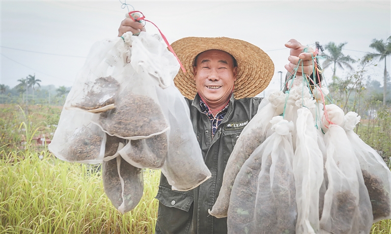 迎着晨光,戴上草帽、穿好水鞋、扛起耙子,热带牧草基地的工人白昌福准备下地收种了。在热带牧草基地呆了近20年,他每天的工作就是辗转于寸寸青草间,将成熟的果荚取下收入尼龙网袋中。而后,与妻子符金科择一个好日头,将种子袋摊开,放在簸箕里进行日光晒种,使果荚壳变干。