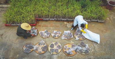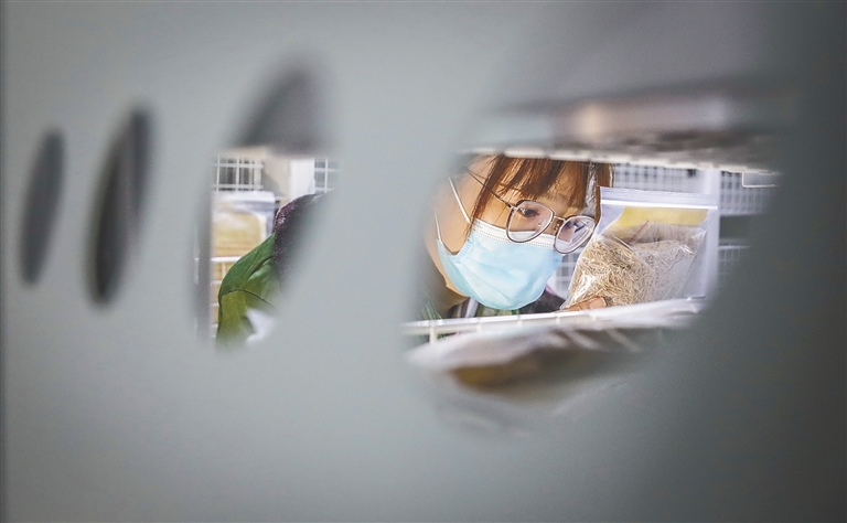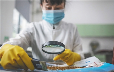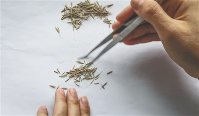 到这一步,还不够!接着进行粗挑选,将混杂在种子里的小枝叶、土块等肉眼可见的杂质挑出。再进行细挑选,借助放大镜,将坏种子、破损种子和混杂的其他种子挑出。经过筛选的种子被装入透明封口袋里。至此,前期的清选工作才算完成,得到的是饱满而纯净的种子。