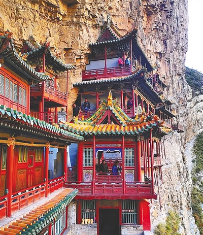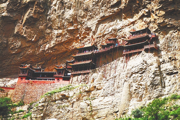 悬空寺面积不大,大小殿宇40余间,沿崖布局,一字排开,渐次增高。攀悬梯、跨飞栈、穿石窟、钻天窗、走屋脊,在立体的空间里,在悬空的崖壁上,我们移步换景,用双脚丈量,用眼睛探究悬空寺的结构之巧。