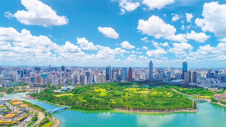海南自贸港建设蓬勃展开,城市发展欣欣向荣。图为蓝天白云下的海口万绿园一带。本报记者 张茂 摄