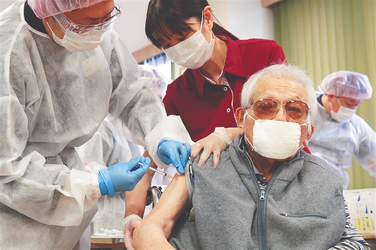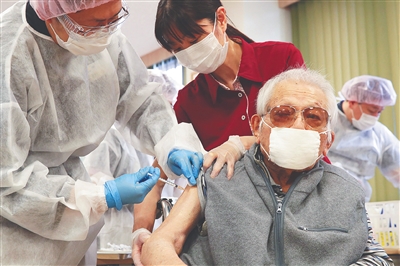 4月12日,一位老人在日本东京接种新冠疫苗。日本政府12日开始为65岁及以上人群接种新冠疫苗,后者成为继医护人员后第二批接种人群。 新华社/法新