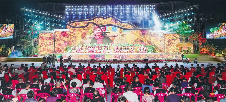 “舞美设计以‘花开三月三’为创作理念,融合木棉、梯田、雨林、船型屋、溪流等具有海南和民族特色的舞台制景,通过现代声光电科技手段,打造耳目一新的微实景演出舞台。”“三月三”昌江主会场总策划林青说,开幕式主题文艺晚会还增加了全民互动、全民参与的环节,带领现场观众参与“民族竹竿舞”“民族广场舞”“民族交谊舞”,真正做到全民同乐、全民同庆。