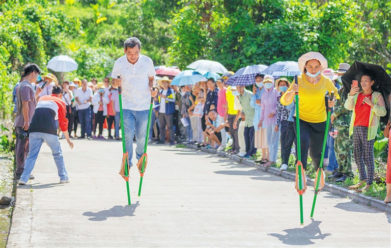“下一组接上”“快,加油”……活动现场,观看踩高跷、猪八戒背媳妇等特色民俗比赛的村民和游客不断发出呐喊声,现场氛围热烈。