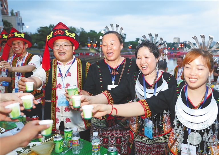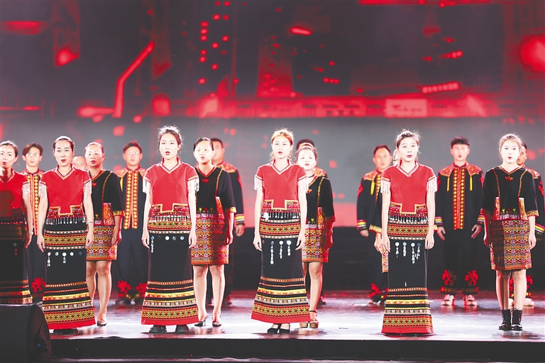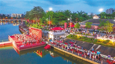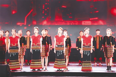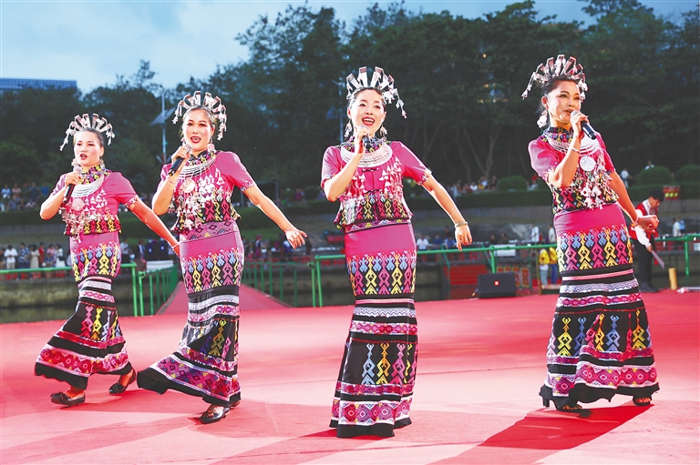 当夜幕降临,华灯初上时,在蜿蜒多姿的南叉河堤上,一曲曲曼妙的黎苗歌舞声响起,游客们落座在河堤两侧的长桌宴席上,尽情分享着糯米糍粑、三色饭、竹筒饭、肉粽、鱼茶、肉茶、福才地瓜、毛薯等当地特色美食,酌饮着灵芝酒、山兰酒等特色美酒,徜徉在白沙儿女唱响民族团结的颂歌旋律里。在“三月三”主题文艺晚会暨篝火狂欢环节,开场歌舞《不忘初心》刚一结束,晚会上篇“情满黎苗三月三”拉开帷幕,黎族歌曲联唱《打鼓歌》《山兰稻》、黎族舞蹈《喜迁新居》《绣》以及群舞《丰收》等节目先后登场,充分展现了白沙黎族苗族同胞对美好生活的向往。在晚会下篇“共铸中华民族梦”,歌舞《绿水白沙自多情》、配乐诗朗诵《承诺》、合唱《灯火里的中国》等节目依序登场,将晚会的喜庆、热闹氛围推向高潮。
