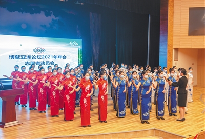 4月15日,在博鳌亚洲论坛会议中心,海口经济学院的大学生志愿者参加博鳌亚洲论坛2021年年会的服务培训。