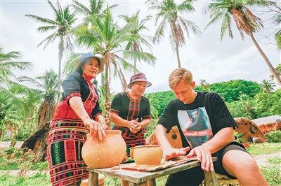 4月15日,昌江黎族自治县在王下乡举行黎花里旅游体验活动,此活动为2021年“三月三”昌江主会场系列活动之一。图为在王下乡洪水村,来自俄罗斯的游客费德体验黎陶的制作乐趣。