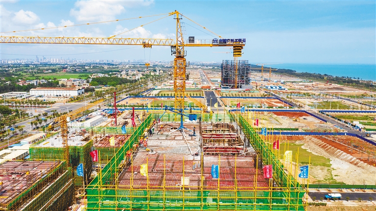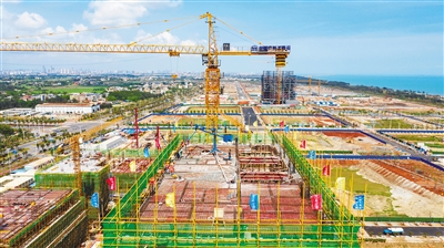 4月13日上午,海口金融中心项目主体结构全面封顶。该项目建成后将引入创新金融服务平台和一站式政务服务中心,推动江东新区金融创新产业转型升级。 文/本报记者 张期望 图/本报记者 李天平
