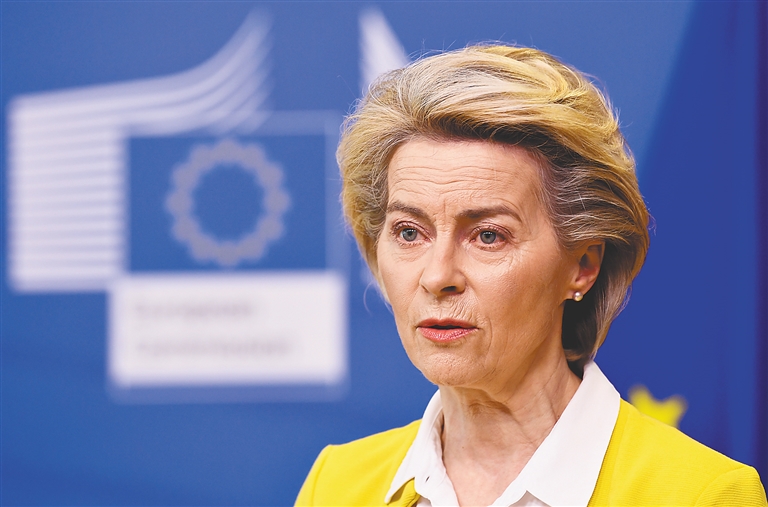 4月14日,欧盟委员会主席冯德莱恩在比利时布鲁塞尔举行的新闻发布会上讲话。