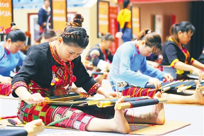比赛现场,参赛选手身穿民族服装,动作娴熟地织锦、刺绣,完成了一件件精美的作品。比赛期间,现场还举办了民族服饰走秀活动,展示民族传统服饰和创意服饰。