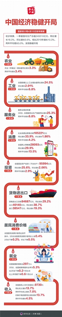 国家统计局16日发布一季度国民经济“成绩单”,GDP同比增长18.3%,环比增长0.6%,中国经济稳步复苏。