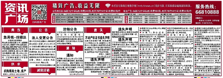 ●海南天华典当有限责任公司不慎遗失典当经营许可证正、副各一本,许可证编码:46110A10010,特此声明。