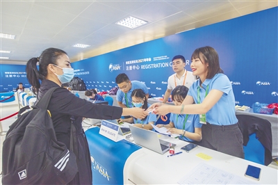 4月17日,博鳌亚洲论坛2021年年会注册中心正式运行,与会嘉宾、媒体记者陆续抵达。图为注册中心的工作人员为嘉宾办理注册手续。本报记者 袁琛 摄