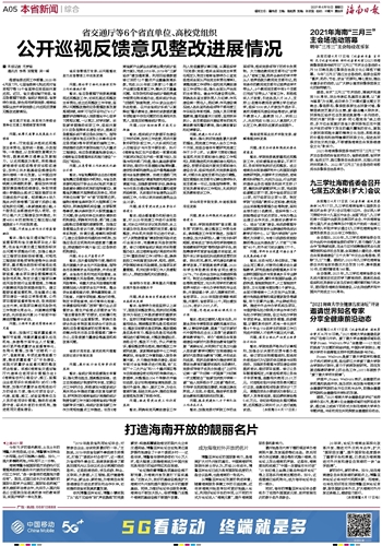 整改:厅党组坚决落实巡视整改主体责任,坚持统一思路、分类指导、一体推进,以自贸港发展需求为导向,提高统筹交通事业发展能力。以巡视整改为契机,积极推进新海港客运枢纽等客货运枢纽建设,加快公共水路基础设施建设和琼州海峡一体化发展。以中国远洋海运集团为主体,加快整合琼州海峡南北岸港航资源。督促加快洋浦国际集装箱枢纽港建设,争取洋浦港小铲滩码头起步工程改造项目早日建成投产运营。彻底解决4年久拖未决的琼海潭门至港下旅游公路征地拆迁问题,3条新建高速公路,6个服务区全部建成并投入使用。农村公路六大工程建设加快推进,长度4850米的控制性工程五指山隧道提前8个月实现贯通。