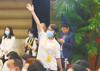 4月18日,在博鳌亚洲论坛2021年年会“健康丝绸之路”分论坛现场,海南日报记者举手争取提问机会。本报记者 李天平 摄