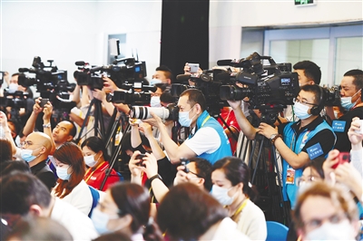 4月18日,博鳌亚洲论坛2021年年会新闻发布会暨旗舰报告发布会举行,众多媒体记者到场采访。本报记者 王凯 摄