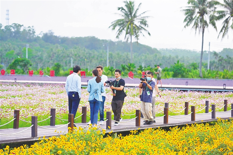 4月18日,琼海市博鳌镇路坡雅叙乡村会客厅,参加博鳌亚洲论坛2021年年会的嘉宾在花海中接受媒体采访。本报记者 王凯 摄