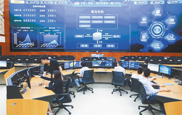 近日,在海南省数据大厅内,工作人员打开海南国际贸易“单一窗口”平台展示系统,大显示屏的各种数据正不断切换。日前,该窗口的海南特色应用进口“零关税区”自用生产设备企业资格申报功能模块正式上线。