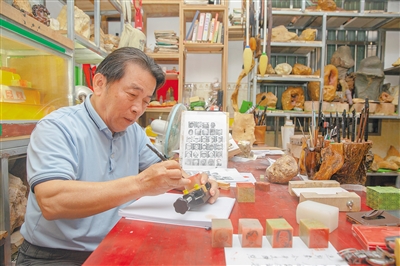 从2018年起,庞启江开始为100位有遗像的红色娘子军镌刻人物印章。以玉石为载体,打磨成拳头大小的方块,再用笔墨描绘出人头像,接着用一把小小的刻刀细细雕磨。平均一个印章要耗时3天,雕刻近7000刀。这些工作均由庞启江一人完成。