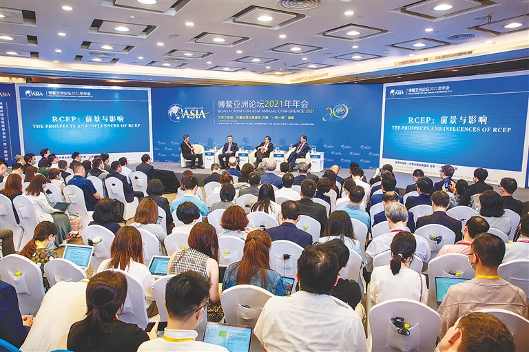 4月19日,在博鳌亚洲论坛会议中心,博鳌亚洲论坛2021年年会“RCEP:前景与影响”分论坛现场。原外经贸部副部长龙永图、中国财政部关税司司长蔡强、香港中文大学(深圳)全球与当代中国高等研究院院长郑永年现场出席,联合国贸易和发展会议秘书长伊莎贝尔·杜兰特通过视频出席并参与讨论。本报记者 袁琛 摄