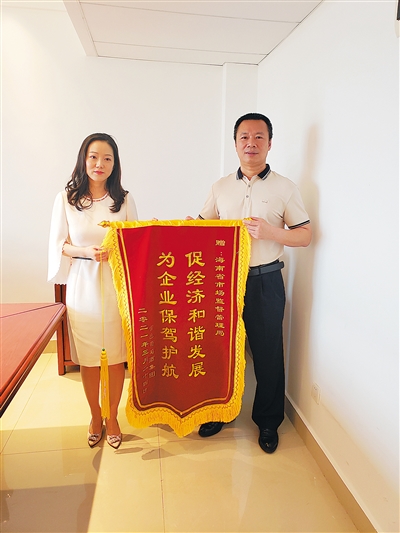 今年2月,海南省市场监督管理局部署了“山寨”进口葡萄酒专项整治行动,整治效果显著。3月31日,一家葡萄酒企业代表(左)专程从上海飞抵海口,给省市场监督管理局赠送上“促经济和谐发展 为企业保驾护航”的锦旗。