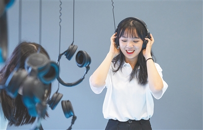| 服务本届论坛的志愿者在听苑内聆听亚洲音乐。本报记者 宋国强 摄 |