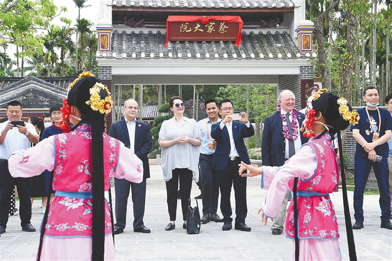 本报博鳌4月21日电(记者尤梦瑜)田园风光,海南风情。4月21日,前来参加博鳌亚洲论坛2021年年会的十余位外国驻华使节来到美丽的博鳌镇留客村,参观蔡家大院。旖旎的自然风景,独特的人文景致,海南美丽乡村为大家留下了深刻印象,也让驻华使节们对海南发展点赞。