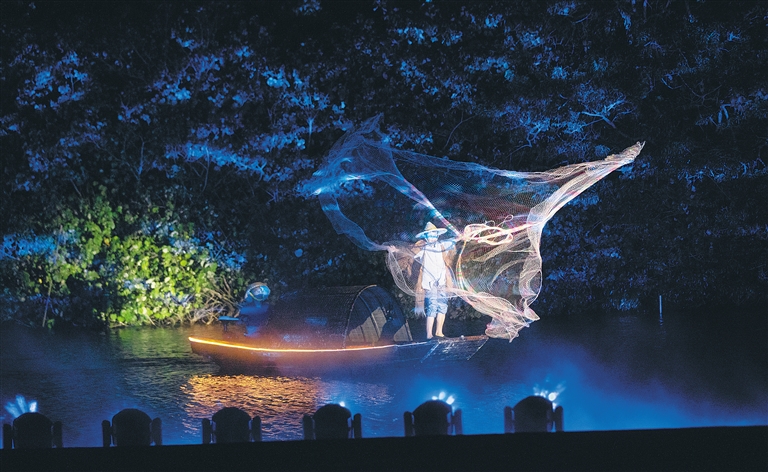 入夜,站在博鳌亚洲论坛主题公园园门,渔船、渔网、渔女一一映入眼帘,仿佛置身于渔村。不知不觉,演出已然开始……