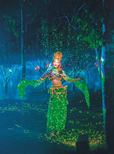 “演艺既是夜游形式,又是在室外环境,对多媒体提出很高要求。”负责演出多媒体部分的工作人员王威也历经了多次调整与修改,“树、水、地等,在不同介质、不同颜色、不同质感上,多媒体呈现的效果也不一样,所以为了跟音乐、灯光等互相配合,取得更好的演出效果,需要进行多次测试、联动测试,以实现‘物之合’。”