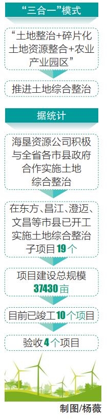据统计,海垦资源公司积极与全省各市县政府合作实施土地综合整治,在东方、昌江、澄迈、文昌等市县已开工实施土地综合整治子项目19个,项目建设总规模37430亩,目前已竣工10个项目,验收4个项目。