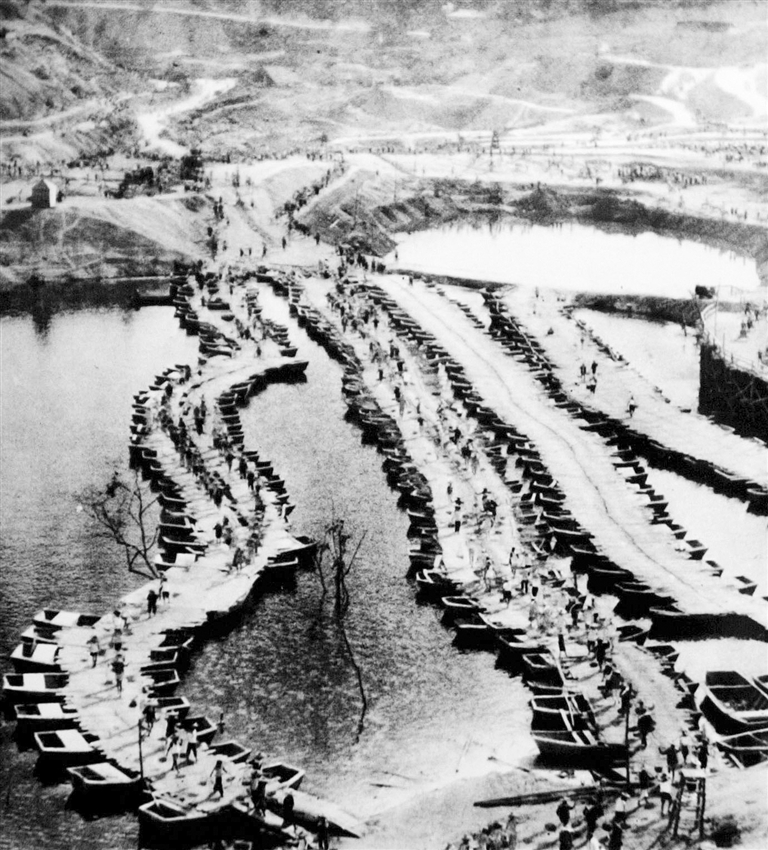 旧 1958年7月8日,松涛水库正式动工兴建。图为松涛水库大坝围堰施工现场。 (本报资料图片)