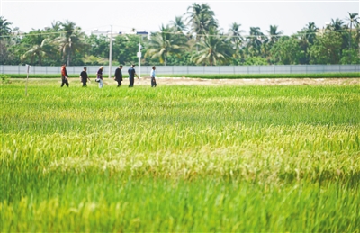 在南京农业大学位于陵水黎族自治县的南繁基地试验田内,生长着适合慢性肾病患者食用的低谷蛋白水稻。4月时节,水稻已经秆青籽黄,预计亩产可达1200斤。