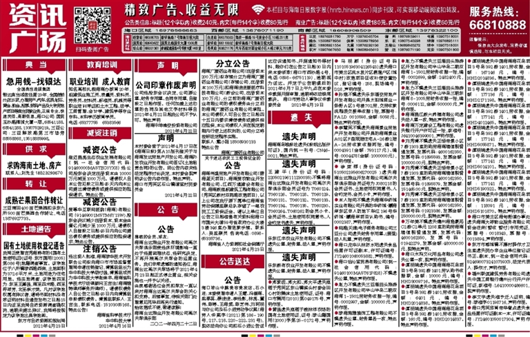 海南南岛晚报社遗失《报纸出版许可证》,国内统一刊号:CN46-0021,特此声明。