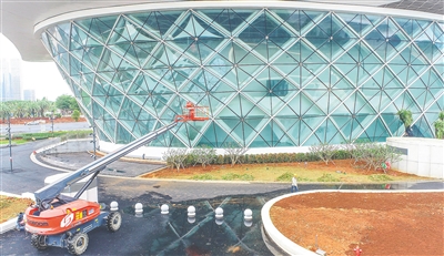 近日,在海南国际会展中心二期项目展馆,工人在进行玻璃线条的安装,以崭新面貌迎接首届中国国际消费品博览会的到来。据了解,首届中国国际消费品博览会将于5月7日至10日在海南国际会展中心举行。其中,国际展区6万平方米,分为时尚生活、珠宝钻石、高端食品保健品、旅居生活和综合服务五大专业展区。本报记者 张茂 摄