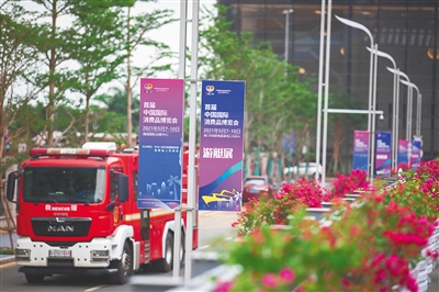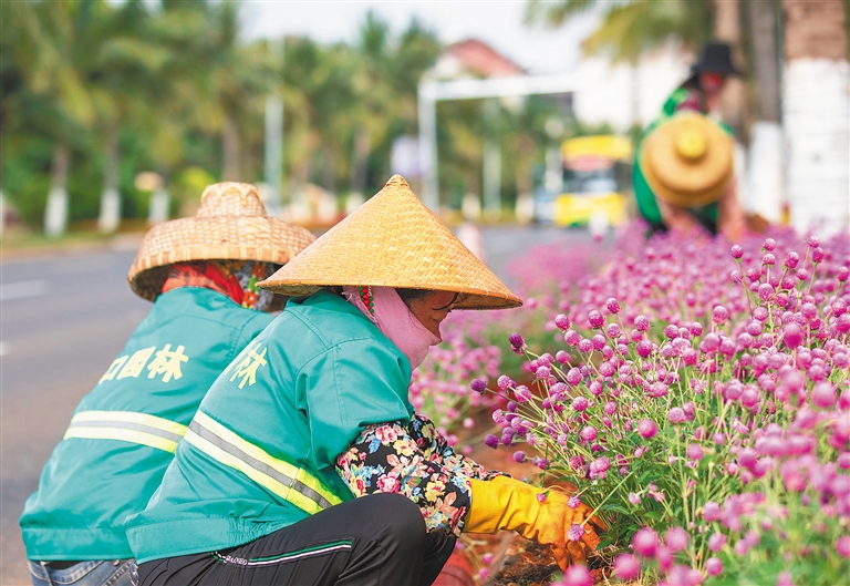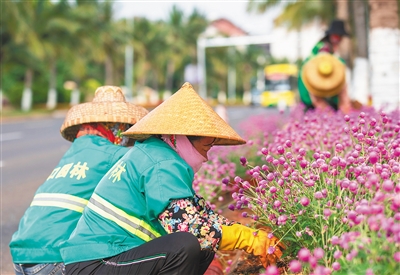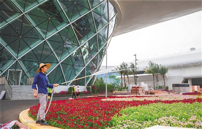 为迎接首届消博会,连日来,海口组织人员在海南国际会展中心周边种植鲜花(图①)、设置灯杆道旗(图②),为新种下的鲜花浇水(图③)。