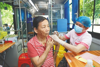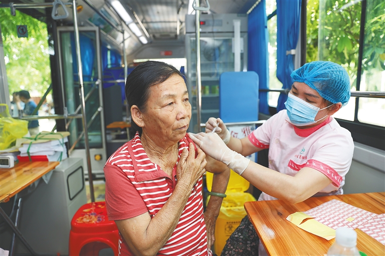 4月25日,澄迈县新冠疫苗接种车开进老城镇罗驿村,护士为村民接种新冠疫苗。本报记者 李天平 摄