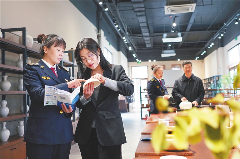 4月25日,在世界知识产权日来临之际,河北省邢台市内丘县市场监督管理局工作人员开展知识产权宣传活动。图为在内丘县邢瓷文化体验馆,市场监督管理局工作人员在介绍知识产权知识。 新华社记者 骆学峰 摄