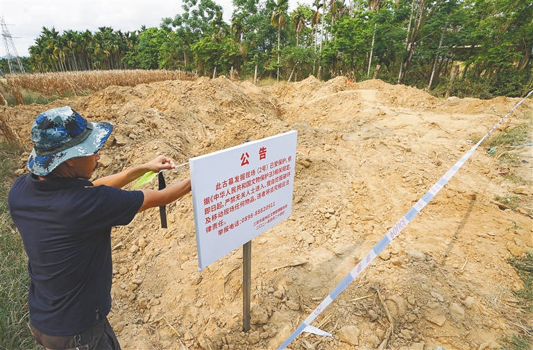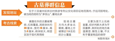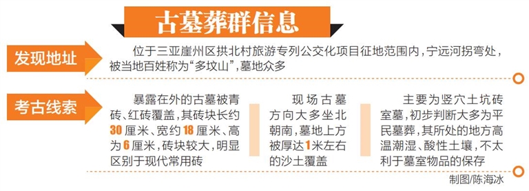 “古墓葬所在地区当地百姓称为‘多坟山’,墓地众多。它位于宁远河拐弯处,常年的洪水冲击带来大量泥沙,容易掩埋坟墓,久而久之,人们就把该地平整成农业用地。” 三亚崖州区历史文化名镇管委会顾问何擎国介绍。