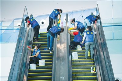 4月27日,在海南国际会展中心,保洁人员在清除电梯上的灰尘污渍。