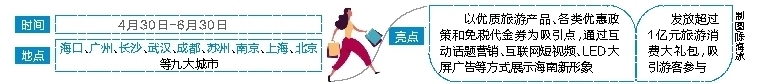 据了解,此次主题推广活动以“健康游 欢乐购”为主题,将依次在海口、广州、长沙、武汉、成都、苏州、南京、上海、北京等九大城市开展,时间从今年4月30日一直持续到6月30日,横跨“五一”假期、首届消博会展期、端午小长假等。系列推广活动将以优质旅游产品、各类优惠政策和免税代金券为吸引点,通过互动话题营销、互联网短视频、LED大屏广告等方式,全景式、多层次、多角度展示海南新形象。