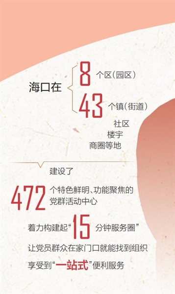 组织难找、阵地难觅,是几年前海口部分流动党员常常反映的痛点问题。为此,海口市委先后在8个区(园区)、43个镇(街道)以及社区、楼宇、商圈等地,建设了472个特色鲜明、功能聚焦的党群活动中心,构建起“15分钟服务圈”,让党员、群众在家门口就能找到党组织,享受到“一站式”便利服务,也让党员与群众之间有了更加紧密的联系。
