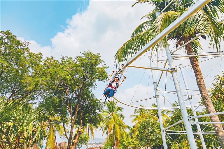 连日来,天涯海角游览区新对外开放的“天涯飞跃”项目吸引了不少游客前去体验游玩。他们在安全人员的指导下,系好安全带,借助索道,穿梭在茂密的丛林中,在享受与大自然亲近的同时,也体会一把惊险与刺激。